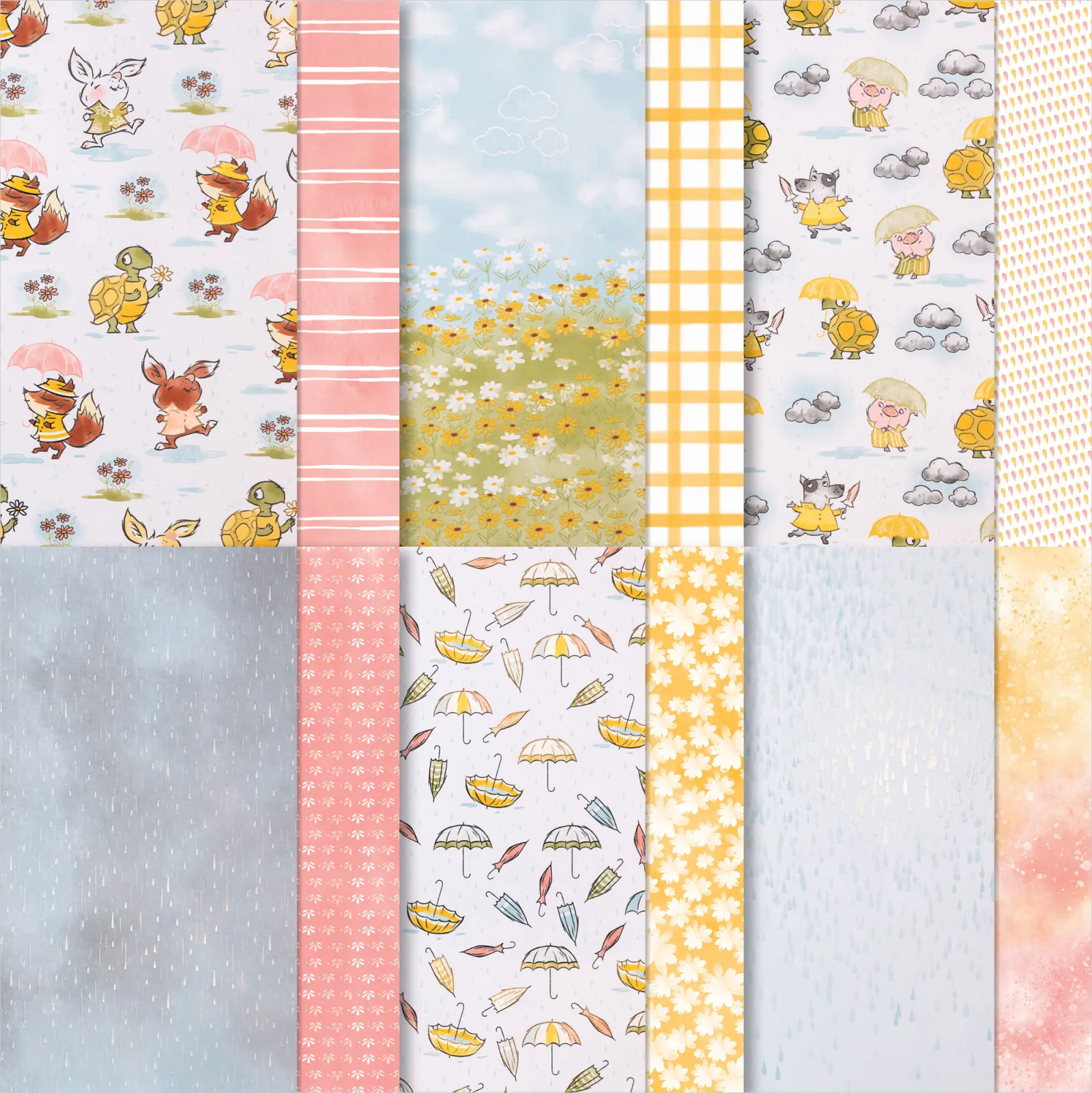 La collection Caprices de météo, qui fait la part belle aux petits personnages, très sympa à coloriser et donc à personnaliser: renard/ lapin/ cochon/tortue, il y en a pour tous les gouts. Ce que vous ne voyez pas sur le catalogue, c'est le détail de finition des papiers design, qui ont un effet de pluie très réaliste , une sorte de lustré transparent. De quoi s'amuser à créer des scénettes en superposant les papiers, les tampons, les ornements marguerites!!